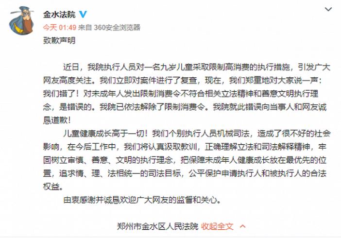 近日,郑州金水法院执行人员对一名九岁儿童采取限制高消费的执行措施,引发广大网友高度关注。12月16日凌晨,金水法院官微发布《致歉声明》,郑州市金水区人民法院表示,立即对案件进行了复查,郑重地对大家说一声:“我们错了!”金水法院指出,对未成年人发出限制消费令不符合相关立法精神和善意文明执行理念,是错误的。该院已依法解除了限制消费令。该院就此错误向当事人和网友诚恳道歉!